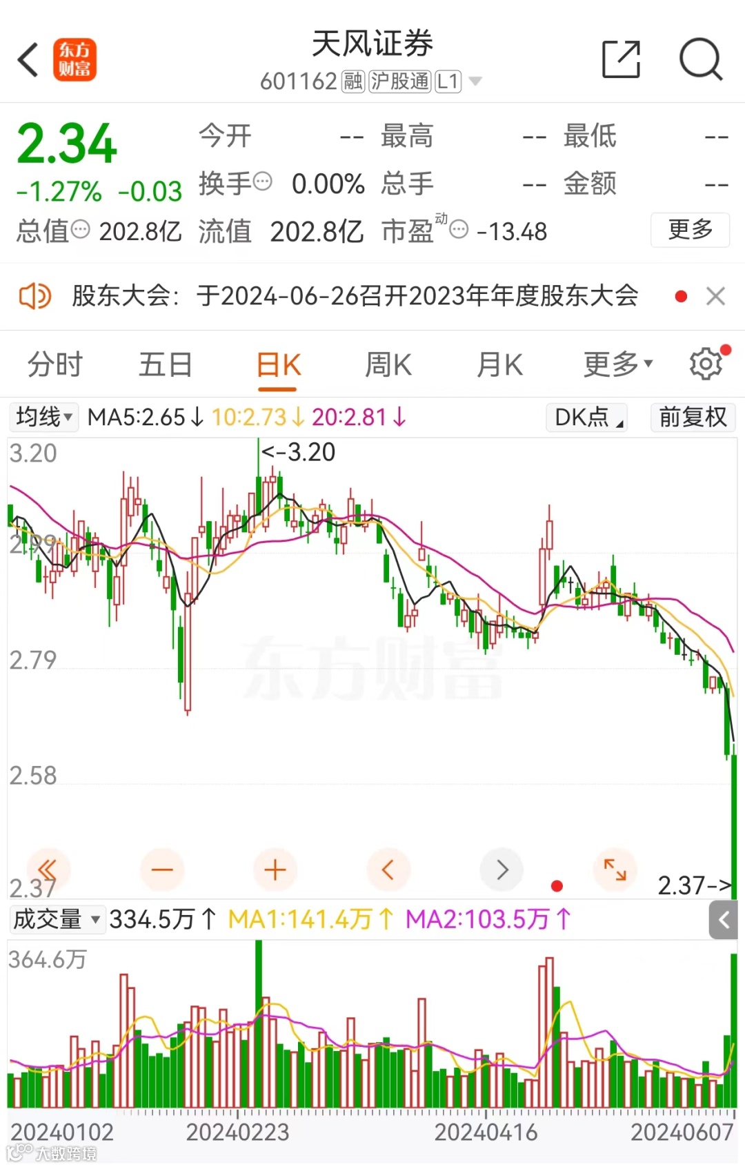 6月7日,天风证券股价午间收盘前突然跳水跌停,午后开盘虽然几度打开跌停,但最终空方力量占据主导,收盘报2.37元/股,跌幅达9.89%。