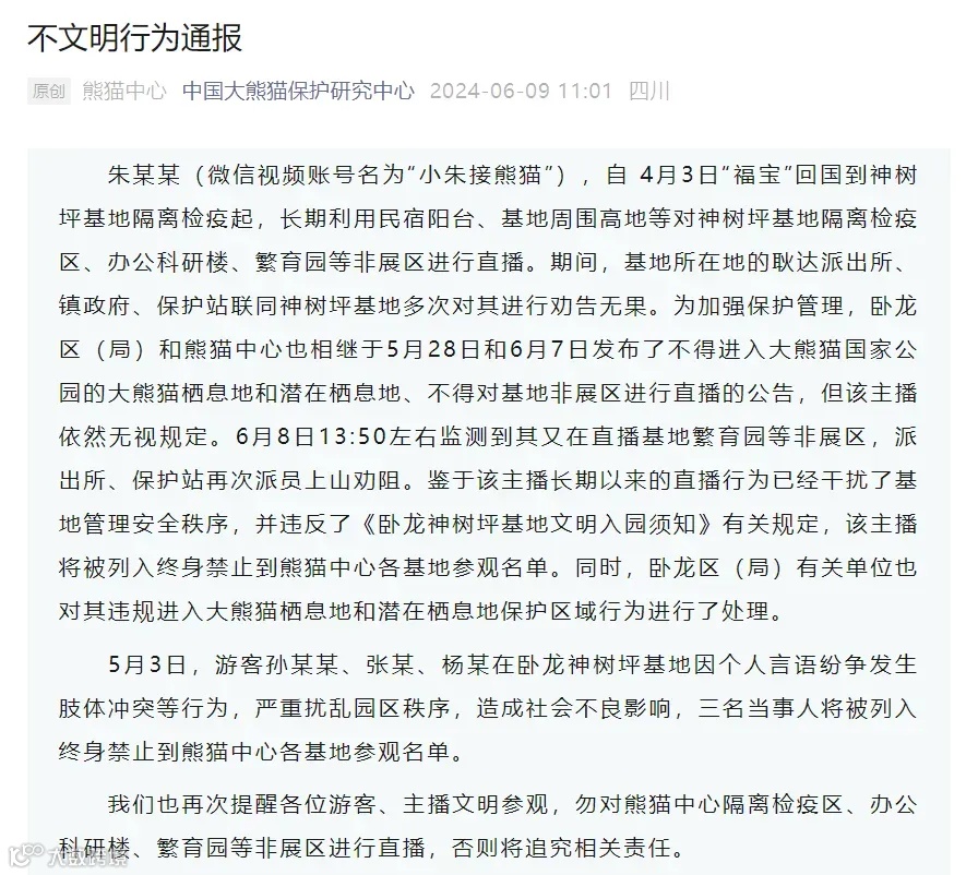 9日,据中国大熊猫保护研究中心最新通报,朱某某(微信视频账号名为“小朱接熊猫”),自4月3日“福宝”回国到神树坪基地隔离检疫起,长期利用民宿阳台、基地周围高地等对神树坪基地隔离检疫区、办公科研楼、繁育园等非展区进行直播。
