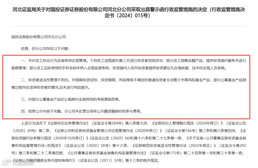 5月21日,国投证券河北分公司收到河北证监局出具的警示函行政监管措施,直指该分支机构存在的四方面问题。