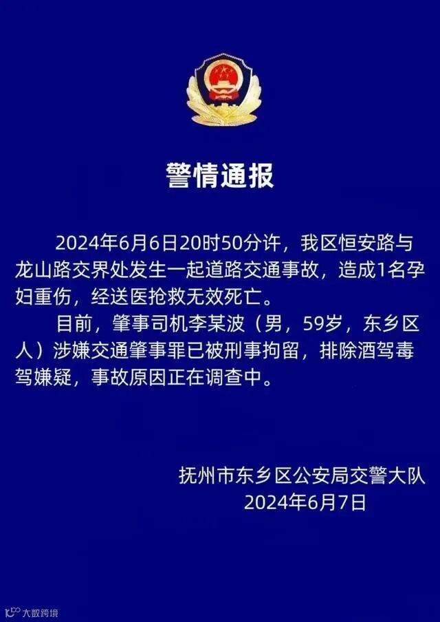 6月6日20时50分许,江西省抚州市东乡区恒安路与龙山路交界处发生一起道路交通事故,造成1名孕妇重伤,经送医抢救无效死亡。据东乡区公安局交警大队通报,肇事司机李某波(男,59岁,东乡区人)涉嫌交通肇事罪已被刑事拘留,排除酒驾毒驾嫌疑,事故原因正在调查中。