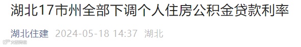 同日,“湖北住建”公众号称,据中国人民银行发布公告,自2024年5月18日起,下调个人住房公积金贷款利率0.25个百分点。截至今天上午,湖北17个市州已全部下调个人住房公积金贷款利率。