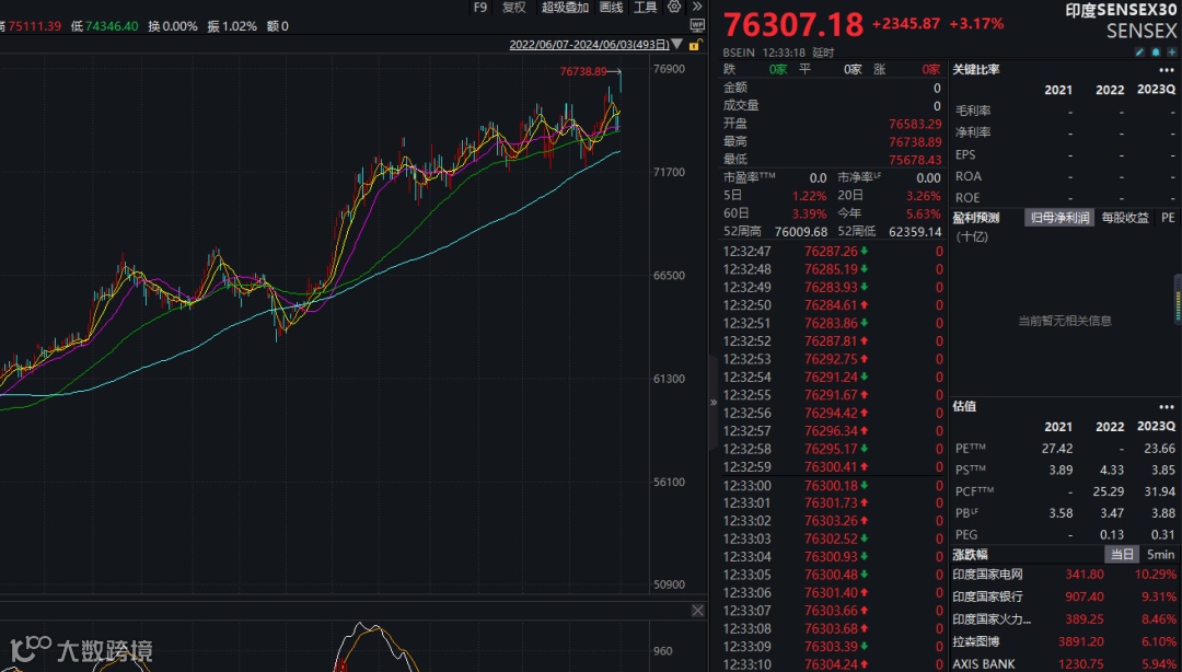 6月3日盘中,印度股市创下历史新高,盘中最高涨幅高达3.6%,截至券商中国记者发稿,印度SENSEX指数涨3.17%报76307.18点。