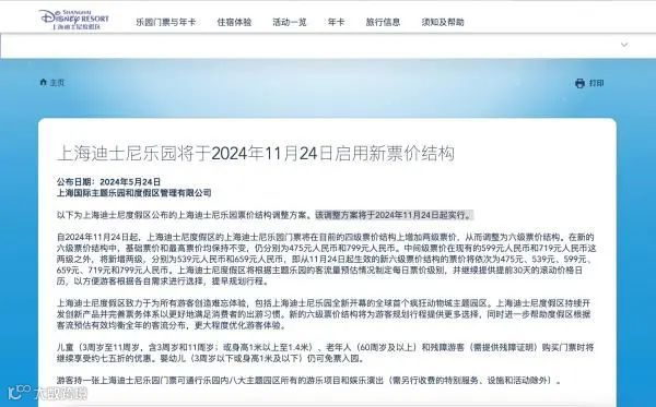 2024年5月24日,上海迪士尼发布新的票价结构通知。上海迪士尼度假区官网 截图