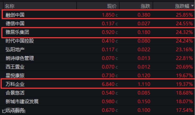 港股内房股也集体大涨,融创中国、雅居乐集团涨逾24%,万科企业涨超19%。