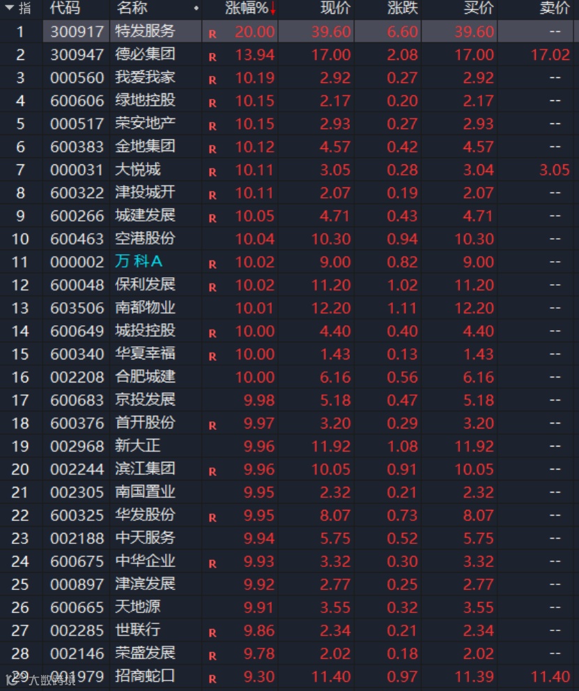 房地产板块大涨超7%,整个板块成交额超过540亿元。特发服务、绿地控股、万科A、金地集团、保利发展、华夏幸福等近30只个股涨停。其中,万科A全天成交超过78亿元。