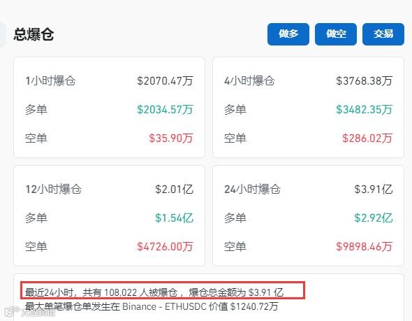 虚拟货币市场又上演惊魂一幕,原本高歌猛进的以太坊,突然在盘中上演大跳水,比特币、BNB、Solana等币种也跟随下挫。24小时内,虚拟货币市场爆仓的人数超10万,爆仓总金额也达到3.91亿美元,折合人民币28亿元。