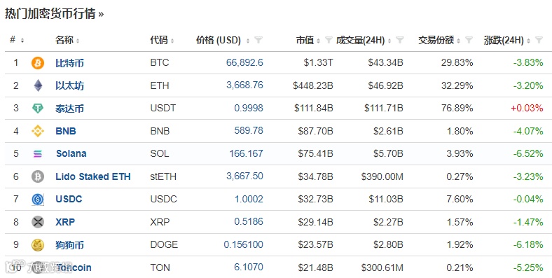 截至券商中国记者发稿时,以太坊报3668.76美元,比特币报66892.6美元,24小时内跌幅均超过3%,狗狗币、Solana跌超6%,Toncoin跌超5%,BNB跌4%。CoinGlass数据显示,24小时内,虚拟货币市场爆仓的人数达到10.8万,爆仓总金额为3.91亿美元。