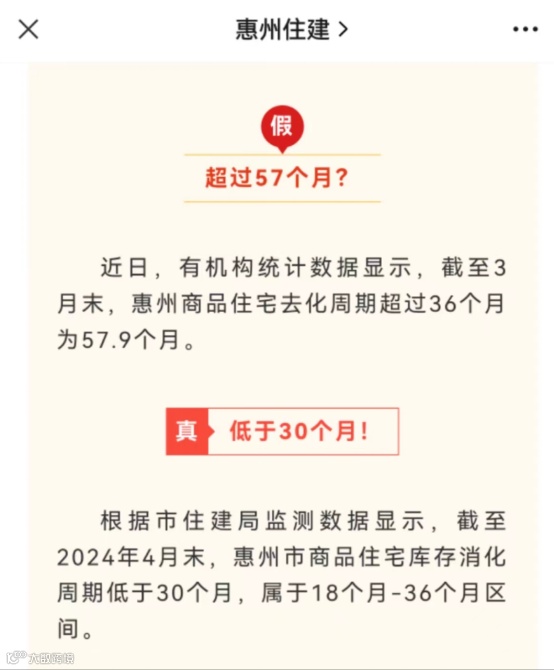 对此,据惠州市住建局“惠州住建”微信公众号消息,惠州市住建局监测数据显示,截至2024年4月末,惠州市商品住宅库存消化周期低于30个月,属于18个月至36个月区间。