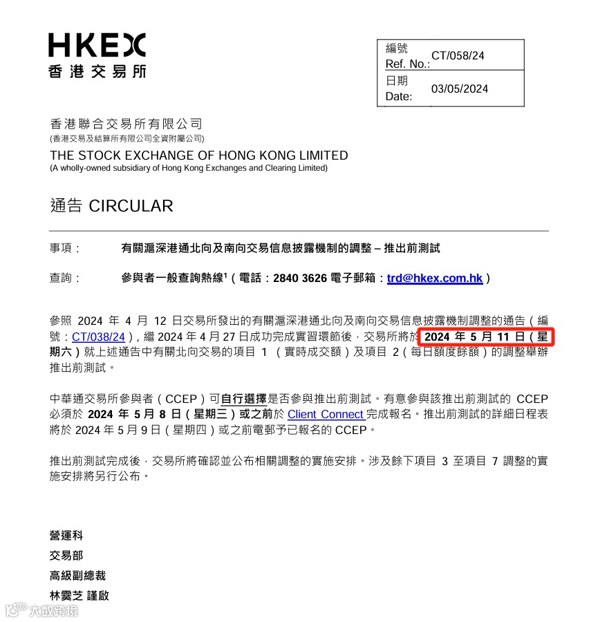 5月3日,港交所发布了《有关沪深港通北向及南向交易信息披露机制的调整—推出前测试》的通知。