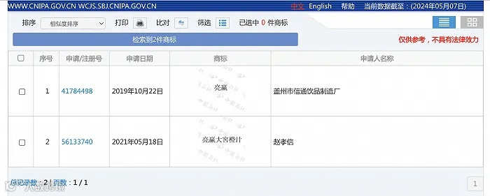 国家知识产权局商标局中国商标网显示,商标“亮赢”于2019年10月22日注册,注册人为盖州市信通饮品制造厂。据达利园公司相关负责人,该公司为盖州信通的委托商,其出示的央视广告播出证明材料显示,盖州信通的亮赢品牌广告,于2023年6、7月在CCTV7、CCTV17荣誉播出。