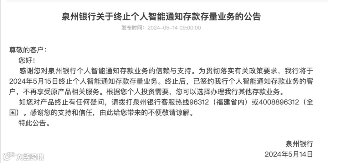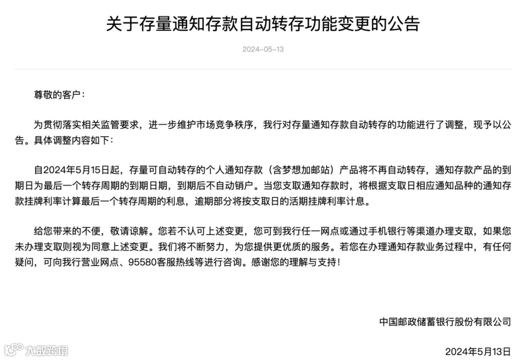 5月14日,邮储银行发布公告称,5月15日起该行存量可自动转存的个人通知存款停止自动转存。同日,招商银行、泉州银行等银行也公告将终止智能通知存款业务。