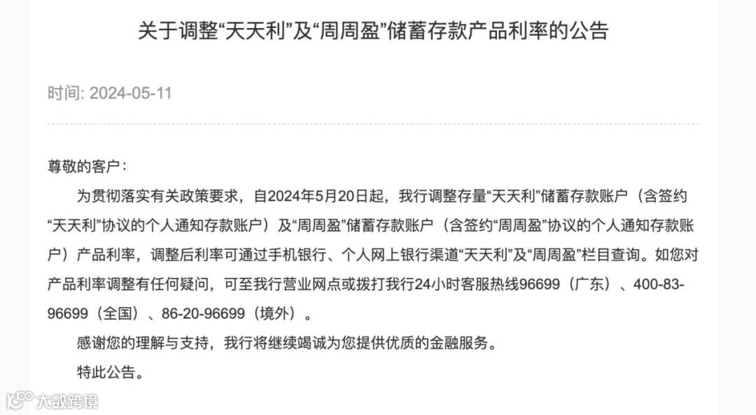 也有银行调整通知存款产品的利率。广州银行发布公告称,自5月20日起,将调整存量“天天利”储蓄存款账户及“周周盈”储蓄存款账户产品利率(包含签约两款产品协议的个人通知存款账户)。