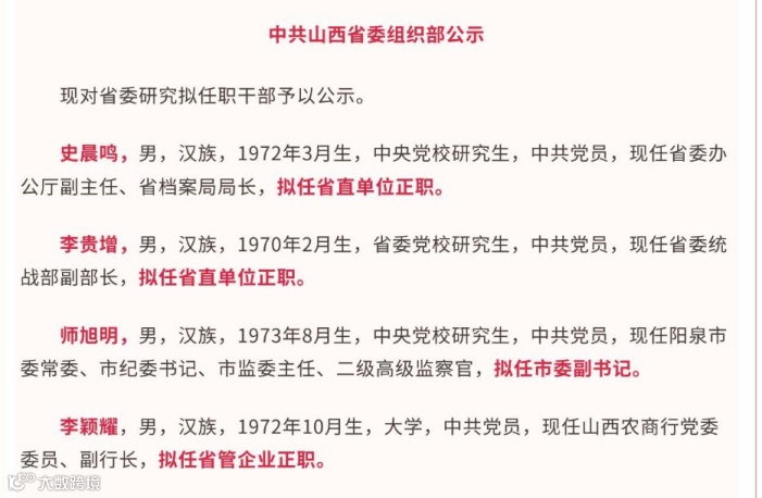 任凯赴任山西农商联合银行后,山西银行行长一职空缺。而时任山西农商联合银行党委委员、副行长的李颖耀同样在上月被公示“拟任省管企业正职”,引发外界关注。