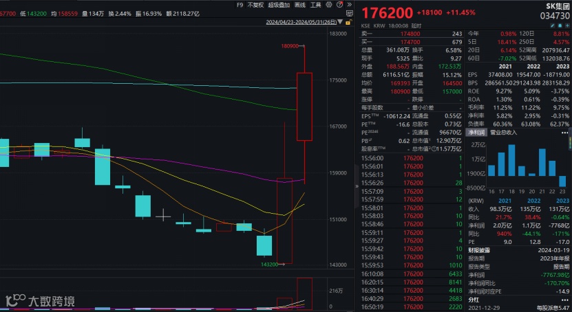 在韩国首尔高等法院作出二审判决的当天,即5月30日,SK集团的股价一度大涨超16%,创出近四年来最大涨幅,最终收涨9.26%。5月31日,SK集团股价继续飙涨,收盘时涨幅超过11%。