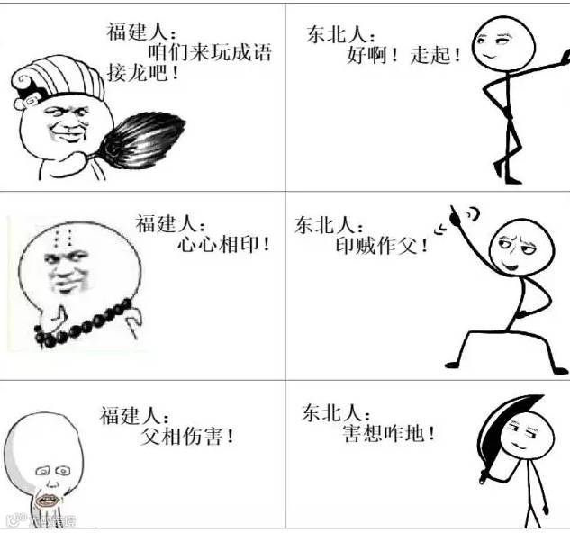 网上流传的一组福建人和东北人玩成语接龙的漫画更是笑到不能自已!