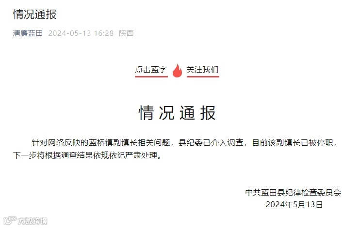 5月13日下午,中共蓝田县纪律检查委员会发布情况通报:针对网络反映的蓝桥镇副镇长相关问题,县纪委已介入调查,目前该副镇长已被停职,下一步将根据调查结果依规依纪严肃处理。