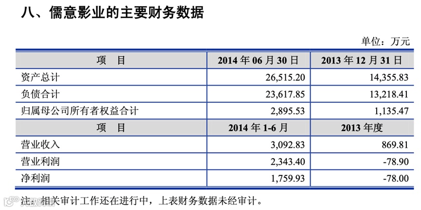 儒意影业2013年的收入为870万元,亏损78亿元,2014年上半年营业收入3093万元,净利润1760万元。当时的儒意影业正处于影视项目变现的起点,柯利明等人许下高额业绩承诺,儒意影业2014年度至2016年度净利润累计需不低于3.9亿元。