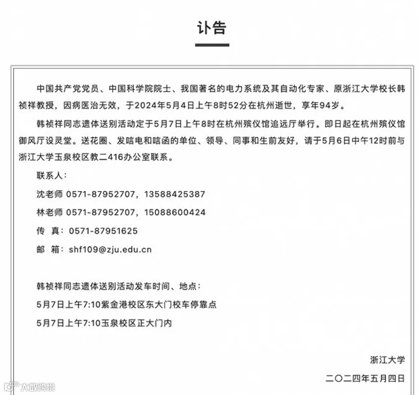 5月4日晚浙江大学电气工程学院发布讣告:中国共产党党员、中国科学院院士、我国著名的电力系统及其自动化专家、原浙江大学校长韩祯祥教授因病医治无效于2024年5月4日上午8时52分在杭州逝世,享年94岁。