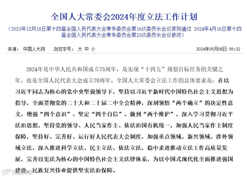 5月8日,全国人大常委会2024年度立法工作计划(下称“立法工作计划”)公布,明确今年继续审议16件法律案,包括关税法、农村集体经济组织法、金融稳定法、增值税法等。今年初次审议23件法律案,包括能源法、民营经济促进法、企业破产法(修订)、反不正当竞争法(修订)、会计法(修订)、反洗钱法(修订)等。
