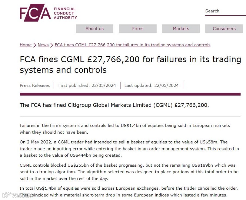 当天,FCA在其官网发布声明称,2022年5月2日,花旗集团在伦敦的一名交易员打算出售价值5800万美元的一篮子股票,但在输入指令时犯了一个输入错误,导致创建了价值4440亿美元的一篮子股票。