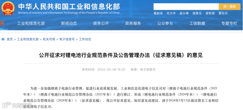 5月8日,据工信部官网,为进一步加强锂离子电池行业管理,促进行业高质量发展,工业和信息化部电子信息司对《锂离子电池行业规范条件(2021年本)》《锂离子电池行业规范公告管理办法(2021年本)》进行修订,形成《锂电池行业规范条件(2024年本)》《锂电池行业规范公告管理办法(2024年本)》(征求意见稿),现公开征求意见。