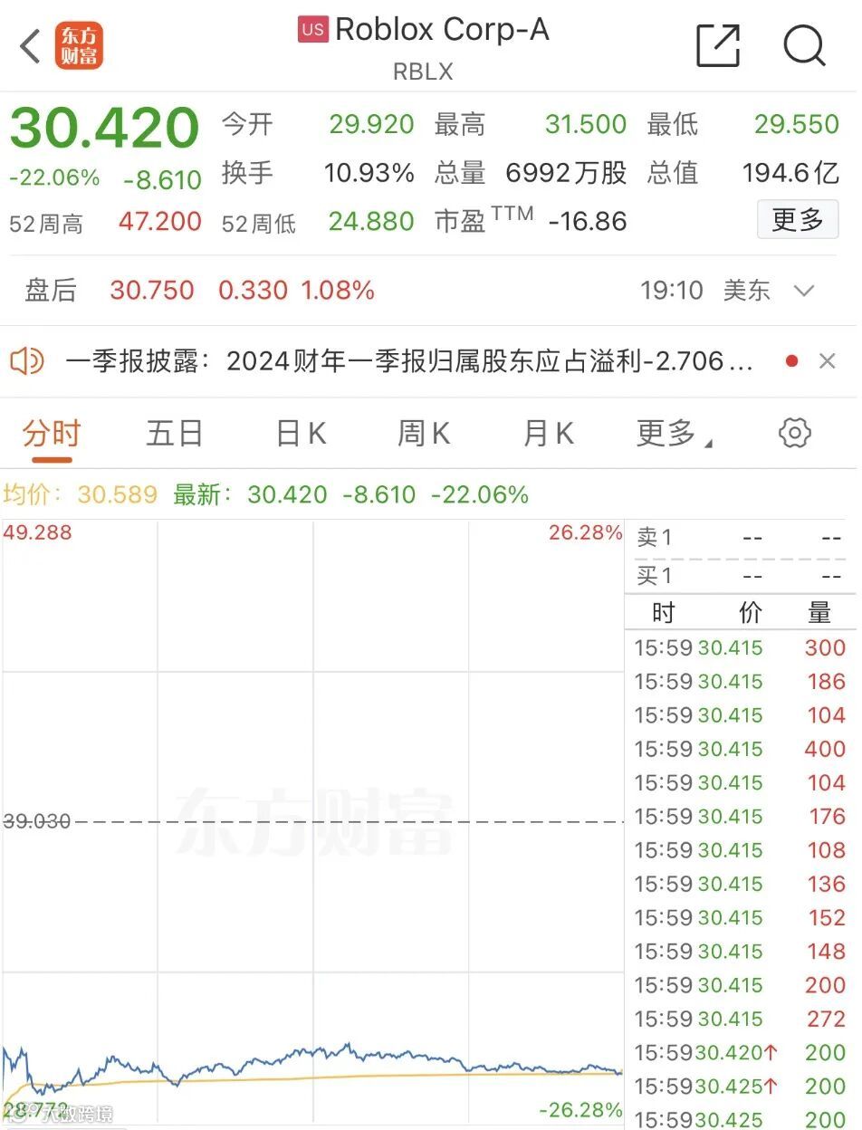 隔夜美股收盘,道指涨0.85%,纳指涨0.27%,标普500指数涨0.51%。其中,“元宇宙第一股”Roblox爆雷,股价暴跌超22%,市值单日蒸发超55亿美元(约合人民币400亿元)。消息面上,Roblox公布了一季度业绩,下调了全年预订额预期,引发了市场对视频游戏行业低迷的担忧。