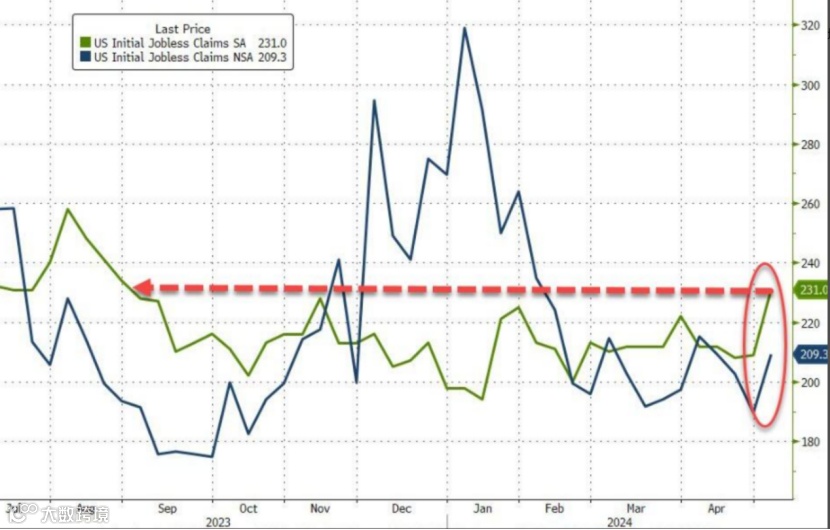 北京时间5月9日晚间,美国劳工部公布的数据显示,美国5月4日当周首次申请失业救济人数为23.1万人,为2023年8月26日以来的单周新高,也是自2021年以来的第三大单周增幅,超出预期21.2万人,前值修正值小幅上修至20.9万人。