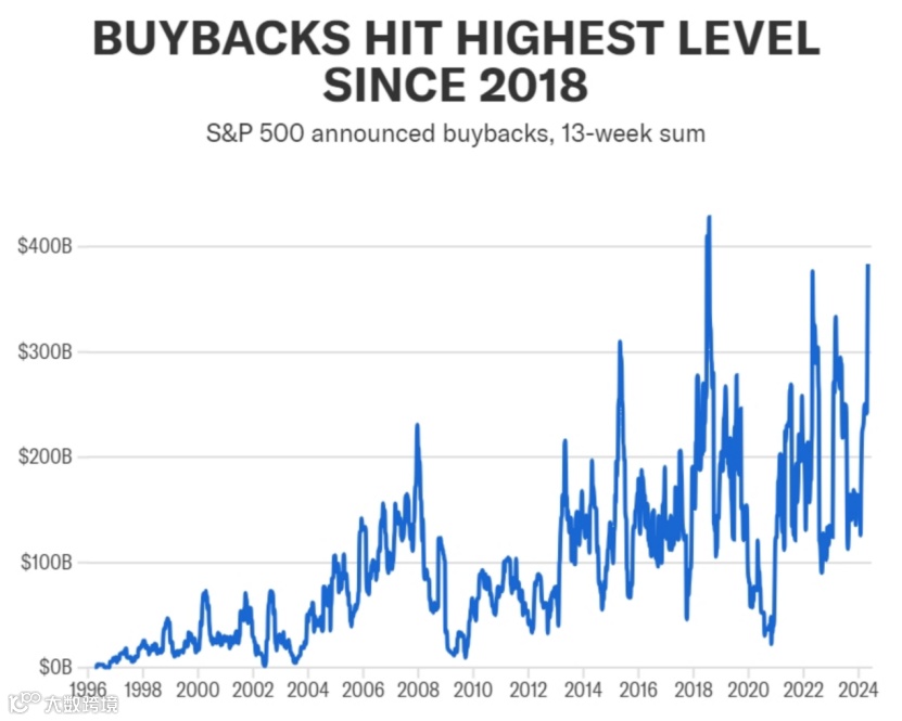德意志银行研究显示,在过去13周中,美股公司宣布的股票回购金额已经超过3830亿美元,较上年同期增长30%,是2018年6月以来的最大金额。