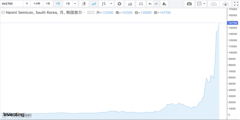 该公司股价狂飙的主要原因是,韩美半导体公司的核心产品TC Bonder踩中了全球AI浪潮,受到了资金爆炒。