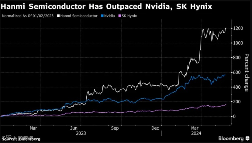 截至5月24日收盘,韩美半导体公司(Hanmi Semiconductor)股价升至147700韩元,年内累计涨幅已高达138%,相较于2022年年底,股价累计涨幅接近1200%。如此凶猛的涨幅,甚至碾压了全球芯片龙头英伟达的股价表现。