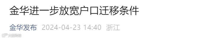 4月23日,据“金华发布”公众号消息,金华进一步放宽户口迁移条件,包括放宽居住落户范围、推行居住证互通互认、试行居住证转户籍、放宽就业落户条件等,明确自今年7月1日起实施。