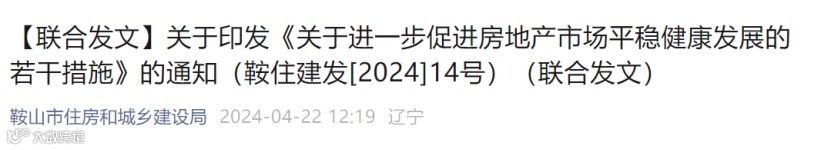 4月22日,鞍山住建局等十个部门联合发布《关于进一步促进房地产市场平稳健康发展的若干措施》。