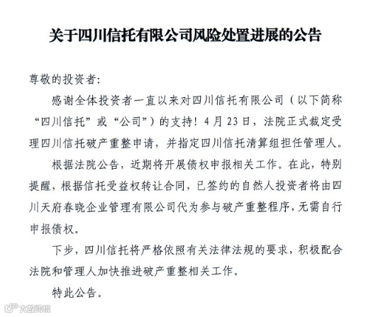 4月23日,四川信托发布《关于四川信托有限公司风险处置进展的公告》称,4月23日,法院正式裁定受理公司破产重整申请,并指定四川信托清算组担任管理人。