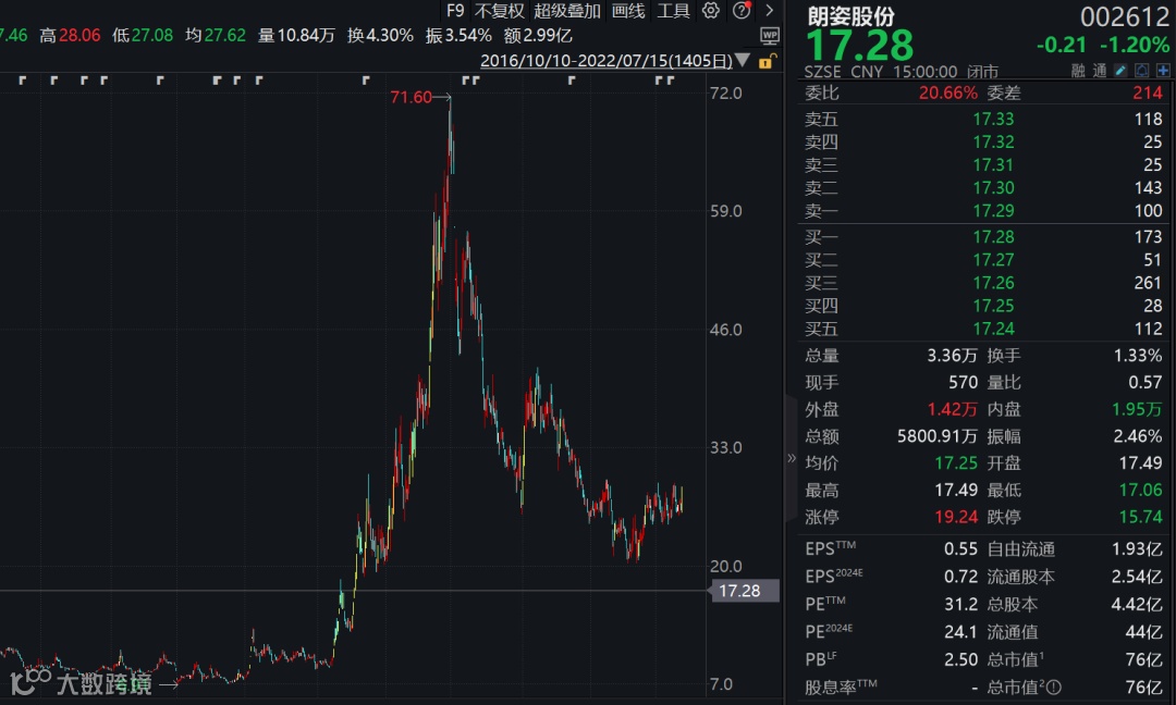2020年3月,谢恺以6.78元/股的发行价认购66.37万股朗姿股份,获配金额为450万元。在此之后,朗姿股份的股价最高涨至70.96元/股。