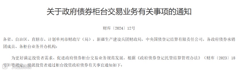 4月29日,为更好满足投资者需求、促进政府债券柜台交易业务规范发展,财政部发布《关于政府债券柜台交易业务有关事项的通知》(下称《通知》),自2024年5月1日起施行。