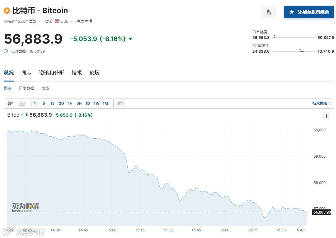 虚拟货币市场风险巨大,时不时上演暴涨暴跌行情。北京时间5月1日下午,以比特币为首的虚拟货币再度上演大跳水行情。其中,比特币盘中相继失守6万美元、5.9万美元、5.8万美元、5.7万美元关口,24小时内跌幅超过8%,最低下探至56663.8美元。