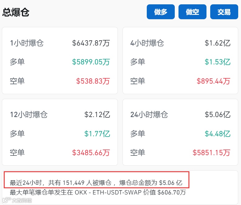Coinglass数据显示,最近24小时内,虚拟货币市场有15.14万人爆仓,爆仓金额达5.06亿美元,折合人民币36亿元。