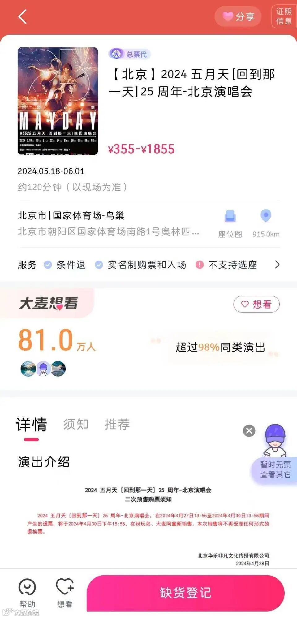 目前距离五月天鸟巢演唱会第一场时间已经很近了,从目前的售票结果来看,受到假唱风波的冲击,五月天的大众口碑虽然受到了较大的影响,但是并没有太大的影响到票务表现,五月天鸟巢演唱会十场同时开票,截至目前已经全部售罄,大麦网上有81万人点击了“想看”,超过98%同类演出。