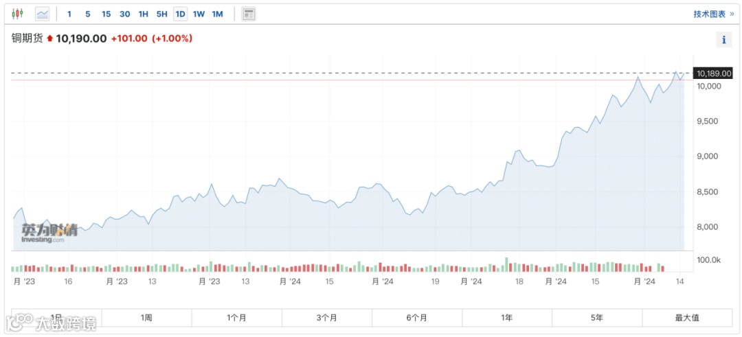 其实,今年以来,铜价格外强势,持续走高。今年4月下旬,LME期铜价格自2022年以来首次突破1万美元/吨。截至目前,LME期铜价格年内累计涨幅超20%。