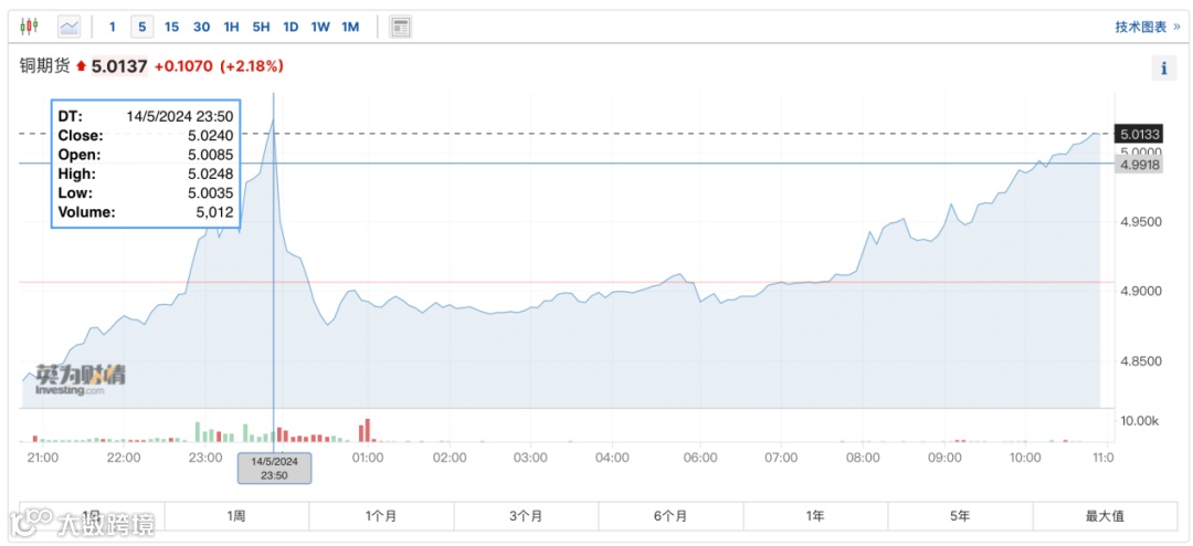 北京时间5月14日深夜,美国交易时段,纽约铜期货价格一度飙升5.5%,Comex7月交割的铜价一度大幅冲高至5.026美元/磅,距离2022年3月创下的历史高点5.0395美元仅一步之遥。