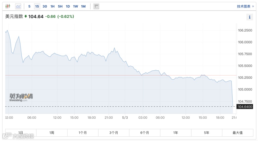 美国4月非农数据公布后,美元指数跳水,刷新4月10日以来的低点,最低报104.52,日内最大跌幅达0.76%。