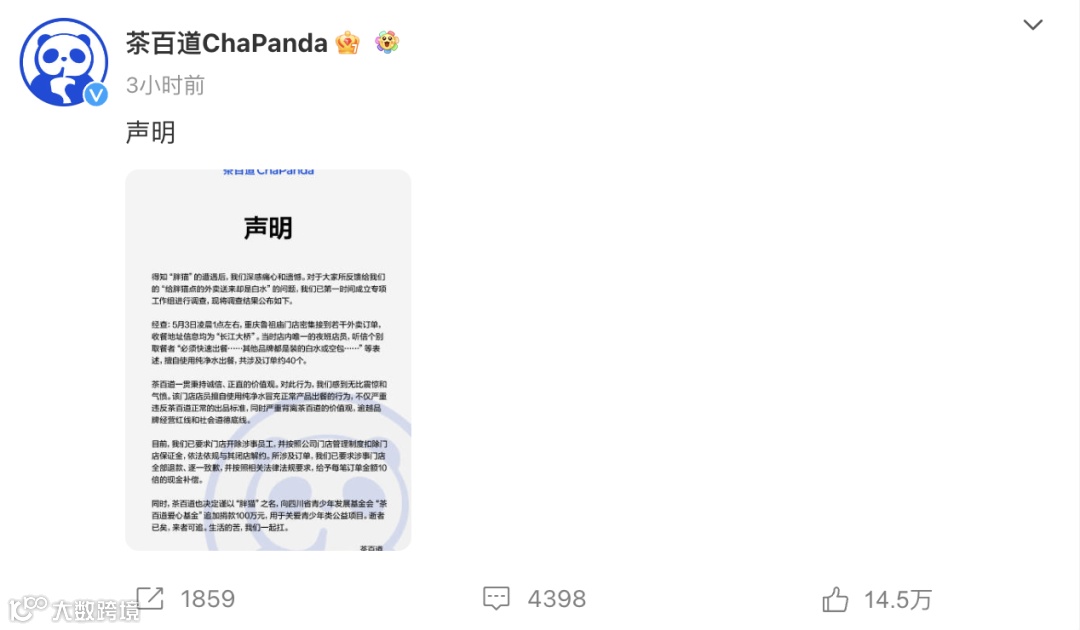 据多名网友爆料称,其为胖猫点奶茶放在江边,结果却发现“茶百道”奶茶里是白水。对此,茶百道发布了详细调查结果,称涉及订单约40个,已要求门店开除涉事员工,并按照公司门店管理制度扣除门店保证金,依法依规与其闭店解约。所涉及订单,已要求涉事门店全部退款、逐一致歉,并按照相关法律法规要求,给予每笔订单金额10倍的现金补偿。同时,决定以“胖猫”之名,向四川省青少年发展基金会“茶百道爱心基金”追加捐款100万元。