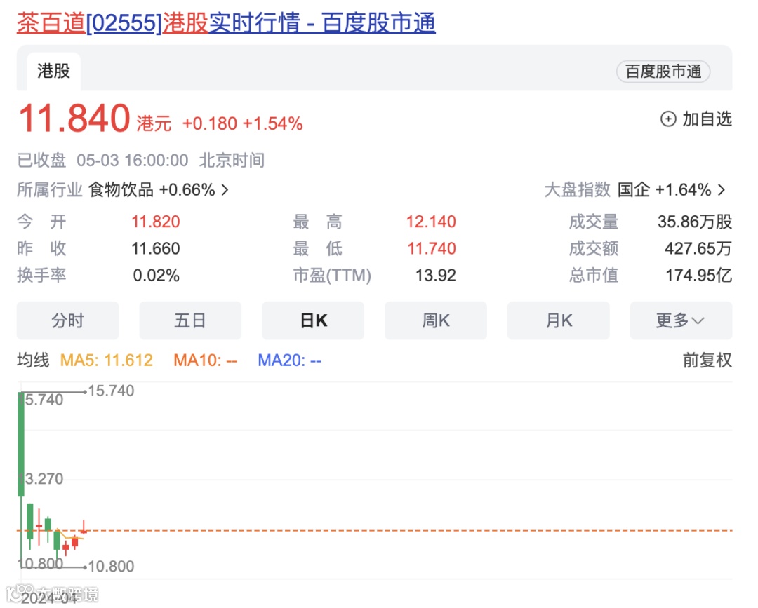 今日,在港股整体走强背景下,茶百道总体股价表现强势,盘中一度涨超4%,截至收盘涨1.54%,报11.84港元/股,较发行价跌超30%。