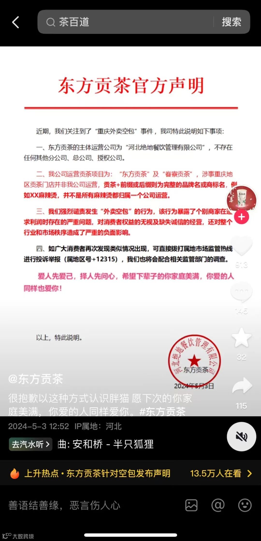 5月3日,东方贡茶抖音账号亦发布声明回应相关事项。