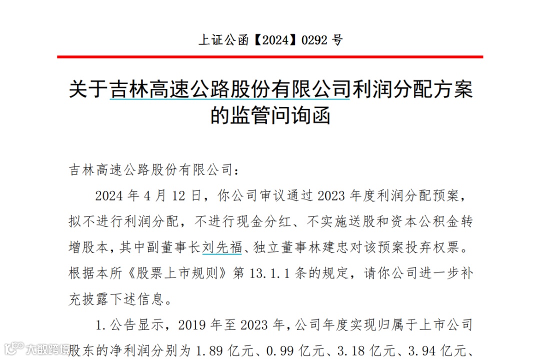 4月15日,上交所向吉林高速下发了关于该公司利润分配方案的监管问询函。
