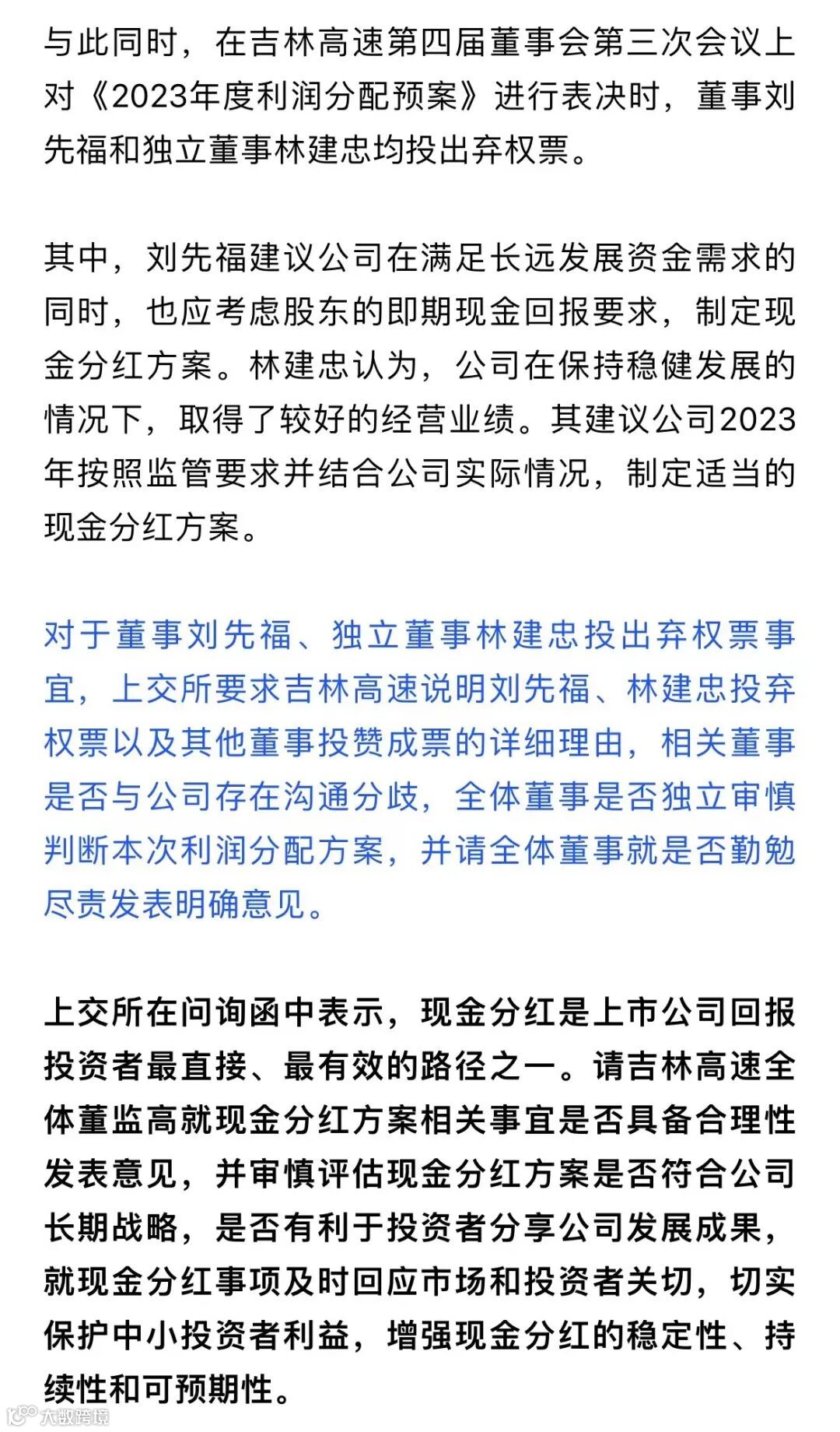 据悉,吉林高速2023年净利润5.46亿元,但是公司审议通过2023年度利润分配预案,拟不进行利润分配,不进行现金分红、不实施送股和资本公积金转增股本,其中副董事长刘先福、独立董事林建忠对该预案投弃权票。