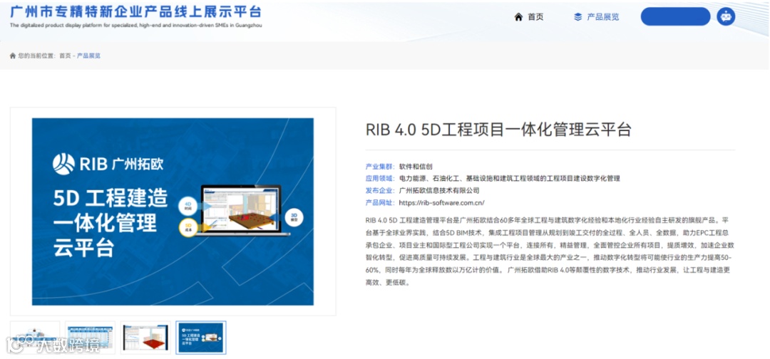 近日,广州市工业和信息化局主办,广州市中小企业专精特新发展促进会承办的广州市专精特新企业产品线上展示平台成功上线。RIB广州拓欧的RIB 4.0 5D 工程项目一体化管理云平台作为首批专精特新企业特色产品登录线上展示平台。