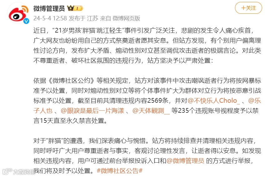 依据《微博社区公约》等相关规定,站方对该事件中攻击嘲讽逝者行为将按网暴标准予以处置,同时对煽动性别对立等将个体事件扩大为群体对立行为将按恶意引战标准予以处置,截至目前共清理违规内容2569条,并对@不快乐人Cholo_ 、@乐子人也 、@眼淚是最后一片海漾 、@天体観測__ 等235个违规账号视程度予以禁言15天直至永久禁言处置。
