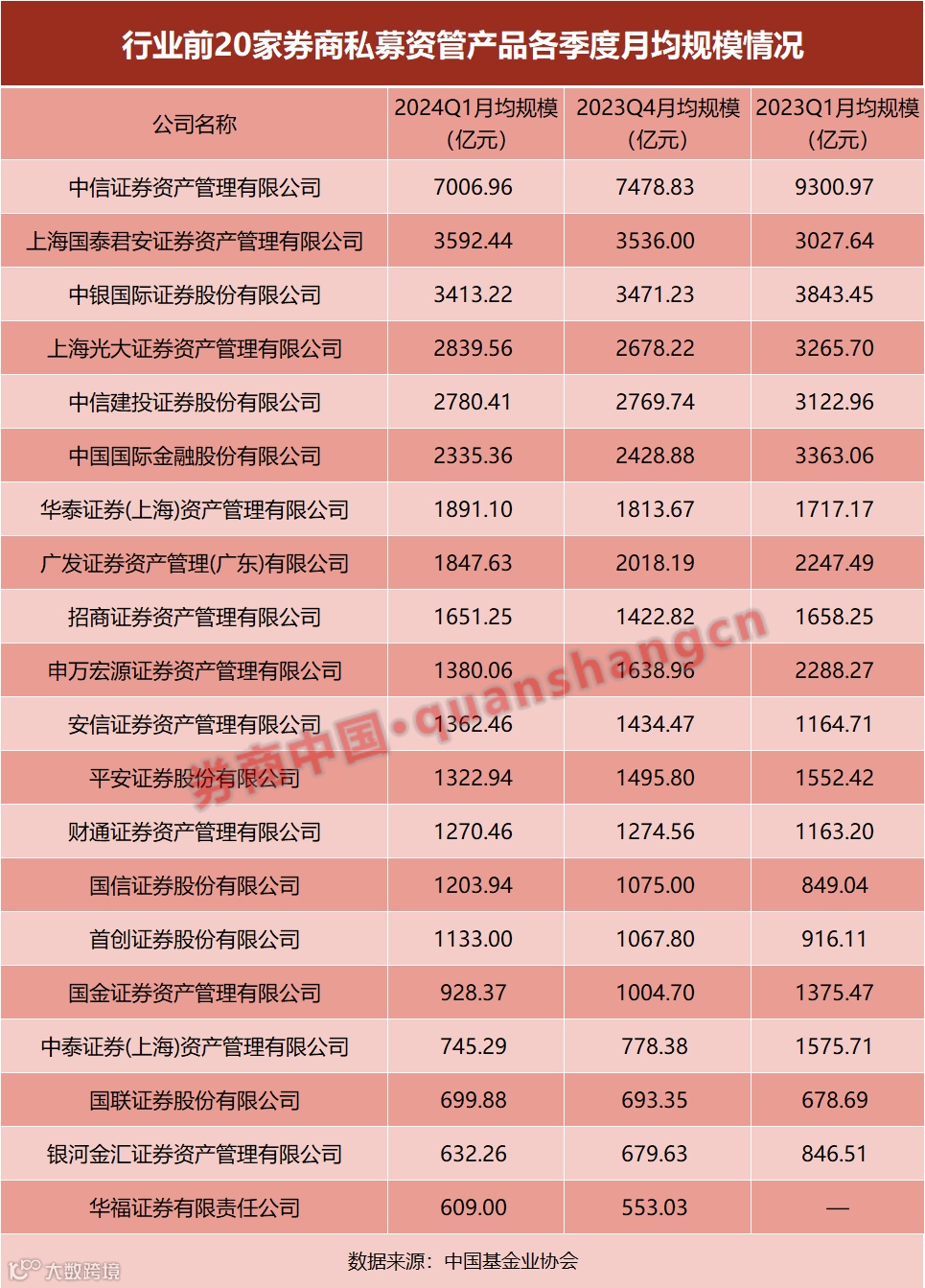 随着4月26日中国基金业协会发布今年一季度各项资管业务月均规模数据,行业前20名券商的资管规模“成绩单”出炉,一定程度上反映行业变化。
