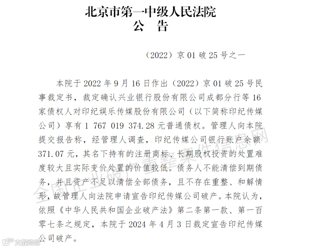 2024年4月3日,北京市第一中级人民法院正式宣告印纪传媒公司破产。